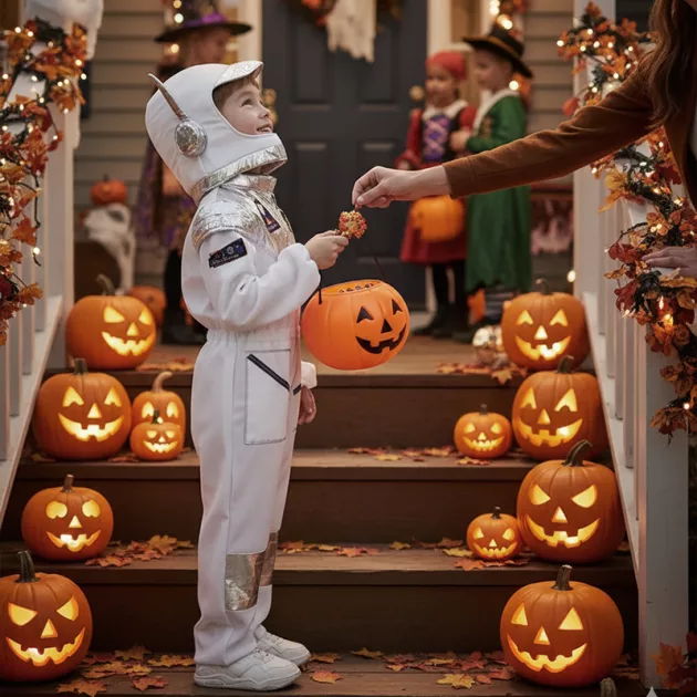 Vårt familjefoto ser fantastiskt ut med mitt barn utklädd till astronaut! De glittriga detaljerna gjorde den extra rolig till Halloween.