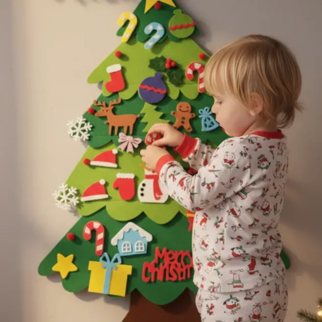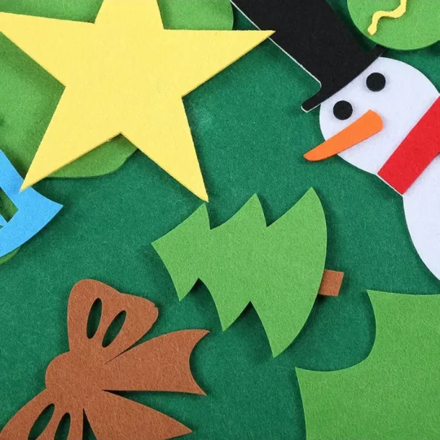Att dekorera filtprydnader var roligare än jag förväntade mig! Min sons fantasi flödade och vi pratade om tomten medan vi fäste bitarna tillsammans.