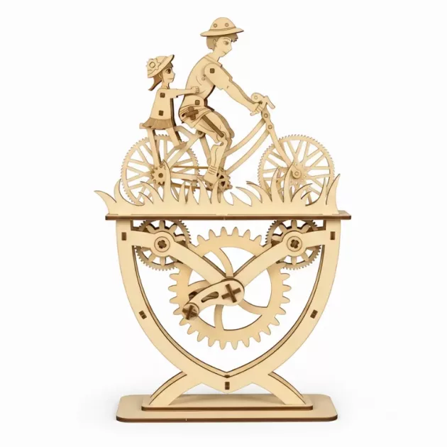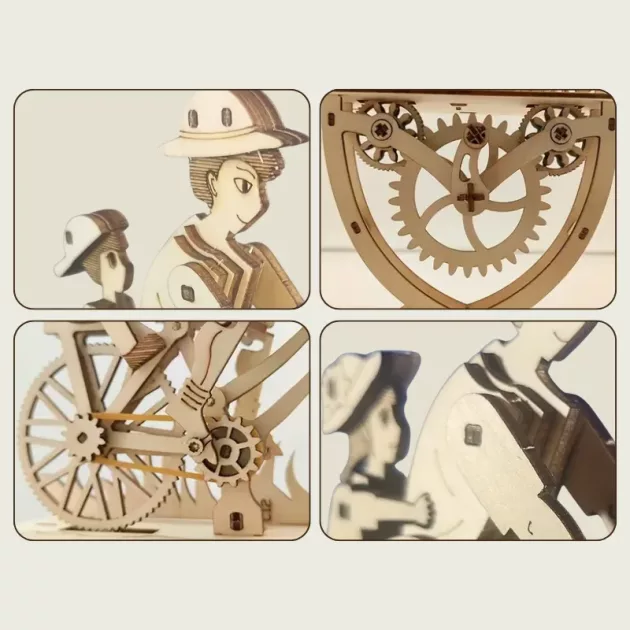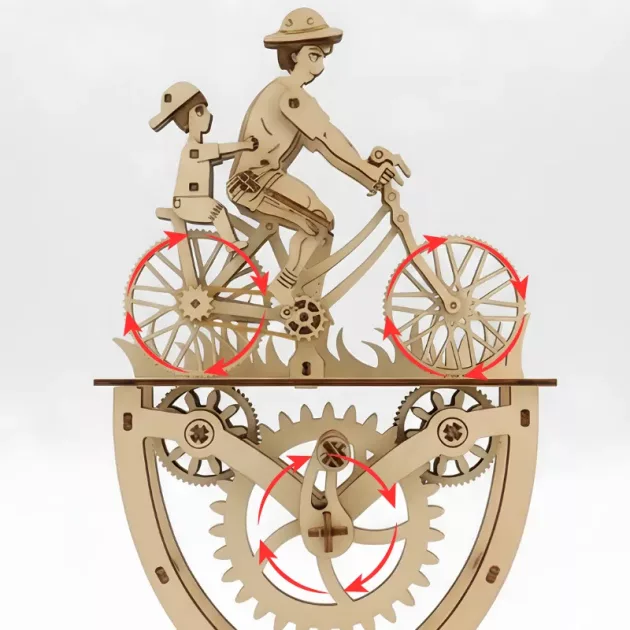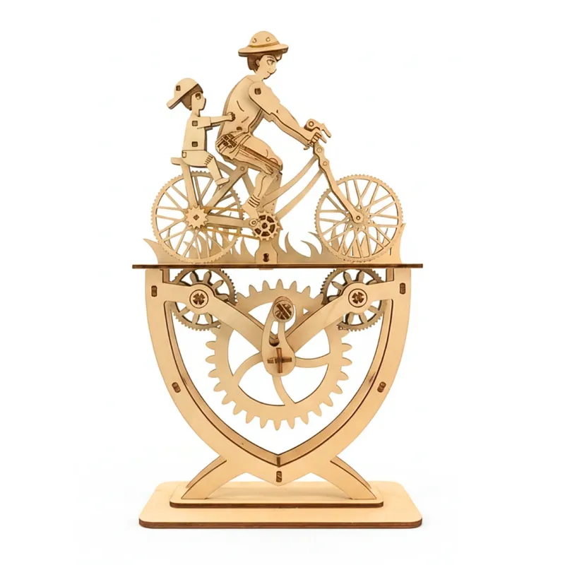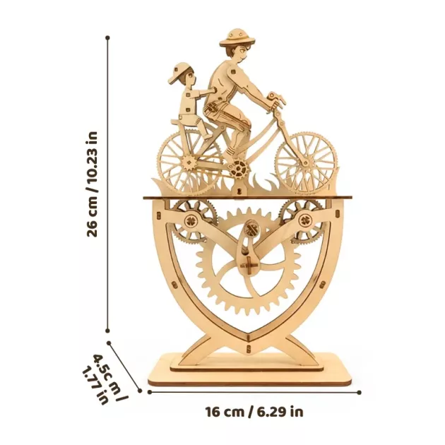 Den här träcykeln är fantastisk! Pappa och jag gjorde en tävling om vem som kunde hitta delarna snabbast. Nu dekorerar den vårt vardagsrum.