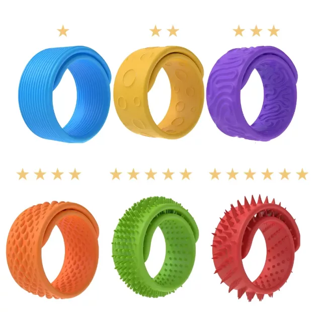 Stötta enkelt ditt barns koncentration var de än är. Dessa färgglada silikonband ger rastlösa händer en rolig och lugnande känsla. Varje flexibelt band har ett unikt mönster för en härlig sensorisk upplevelse. Lätta att bära och säkra för daglig användning hjälper de barn att känna sig bekväma under hektiska stunder.
