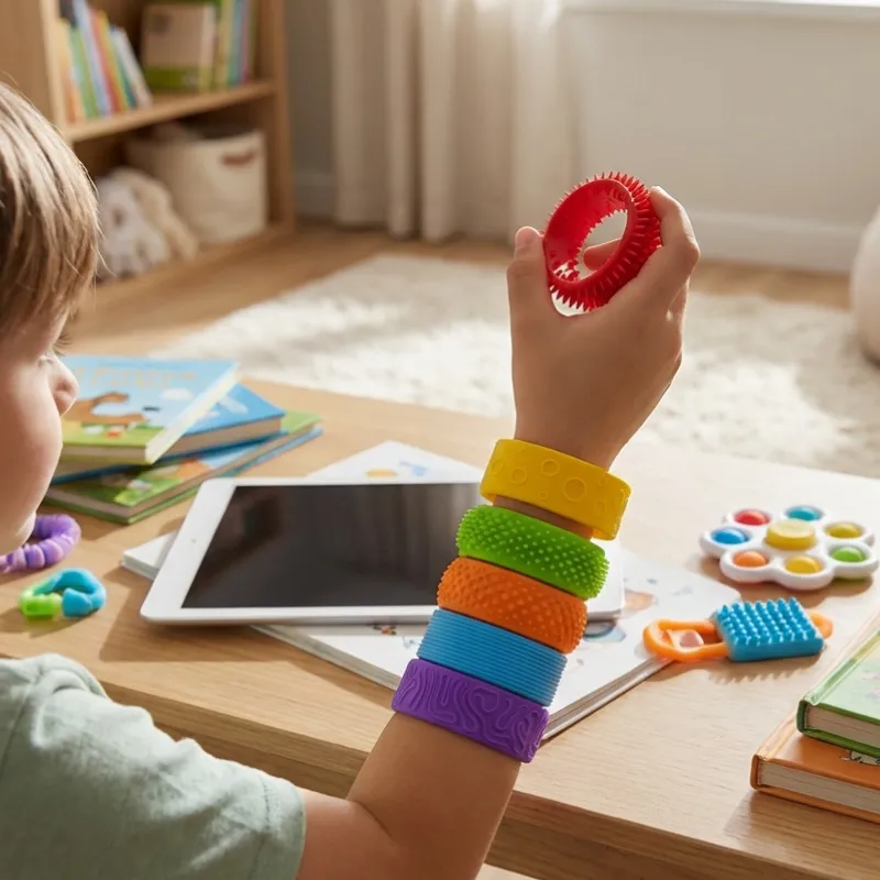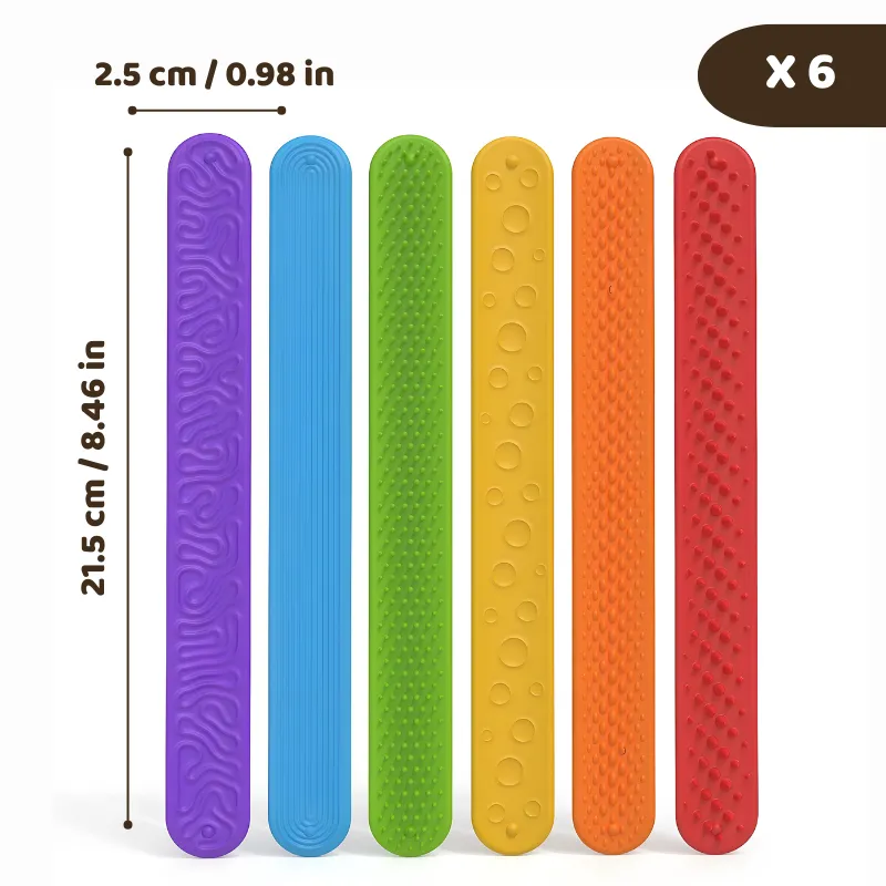 Stötta enkelt ditt barns koncentration var de än är. Dessa färgglada silikonband ger rastlösa händer en rolig och lugnande känsla. Varje flexibelt band har ett unikt mönster för en härlig sensorisk upplevelse. Lätta att bära och säkra för daglig användning hjälper de barn att känna sig bekväma under hektiska stunder.