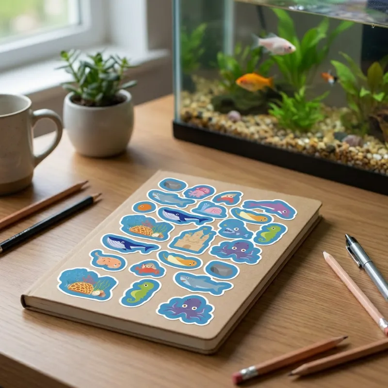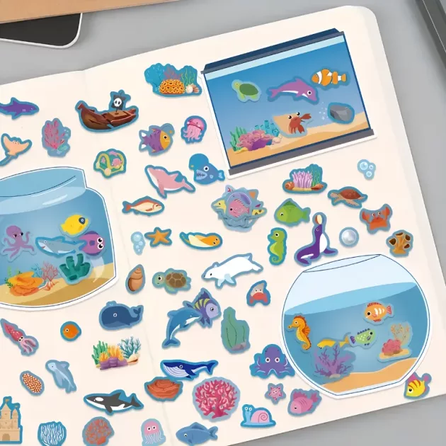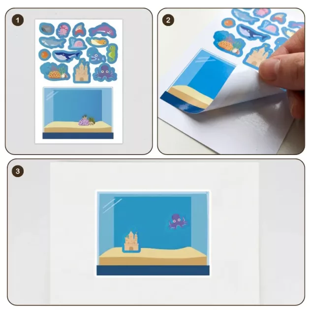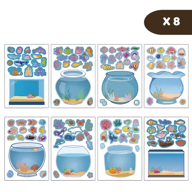 Förvandla en regnig eftermiddag till en kreativ resa. Färgglada klistermärken ger havetsi liv.je aktivitet håller små händer sysselsatta och inspirerar fantasin. Njut av gemenskap och skratt när ditt barn bygger sitt drömakvarium.