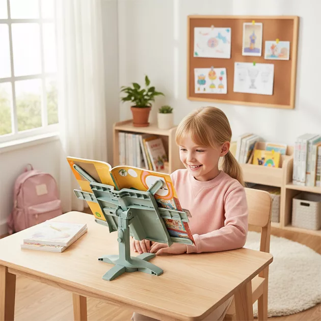 Barn sitter ofta krökta när de läser under längre perioder. Denna bokhållare håller materialet på rätt höjd och vinkel. Deras nacke och rygg känns bekväma varje gång studerar.