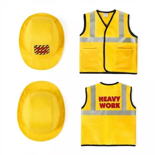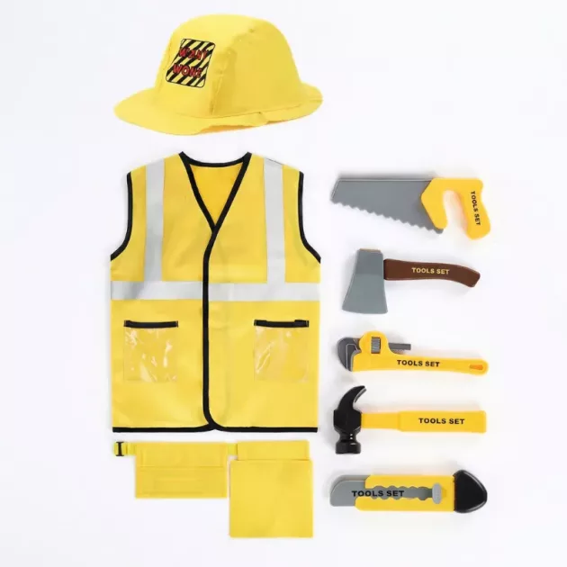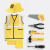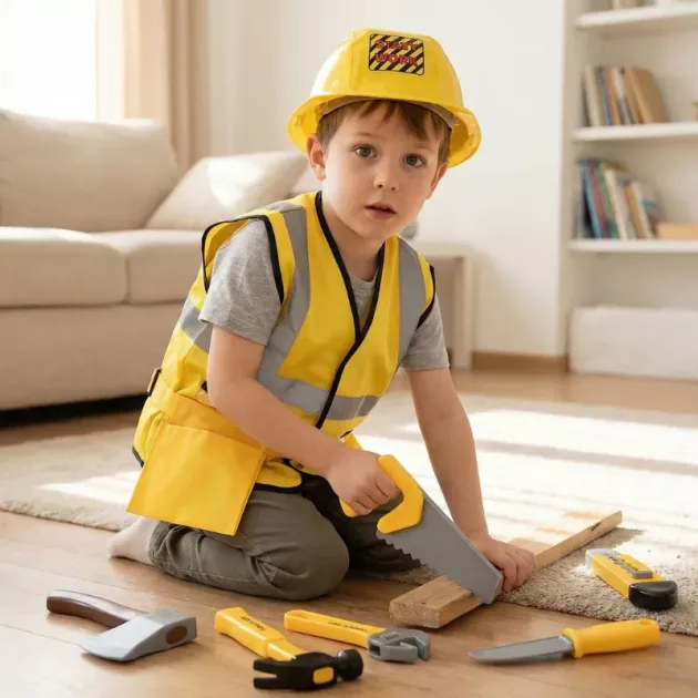 Vi använder den här kostymen under familjespelkvällar. Ett barn är arbetsledare och hittar på låtsasreparationer, medan kusinerna samlar verktyg och lär sig samarbeta.
