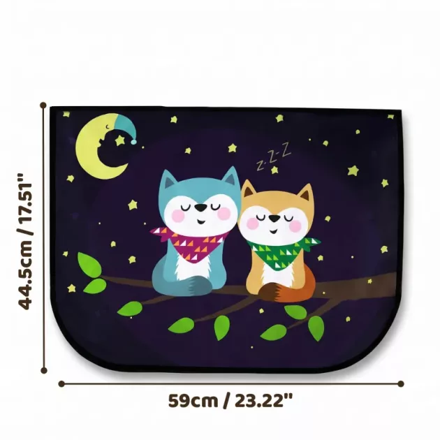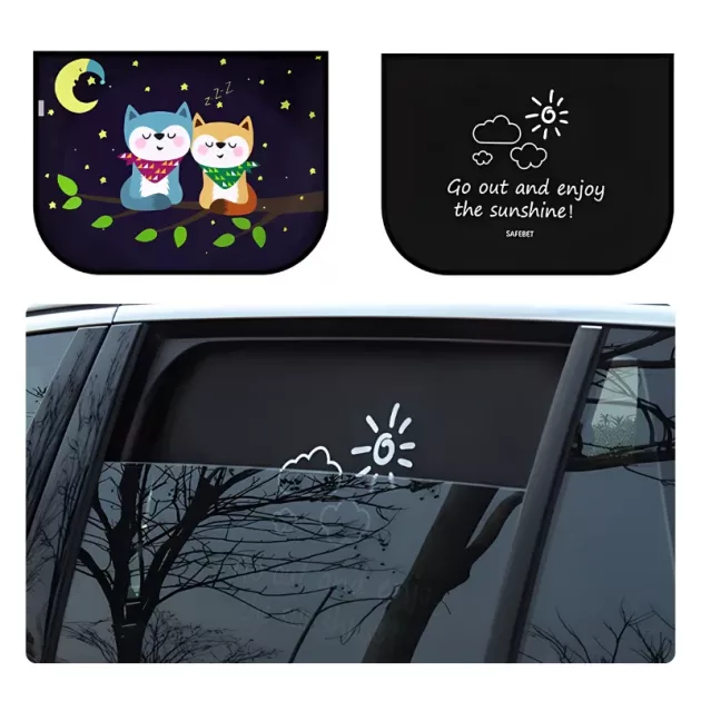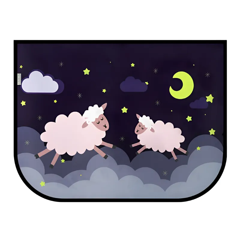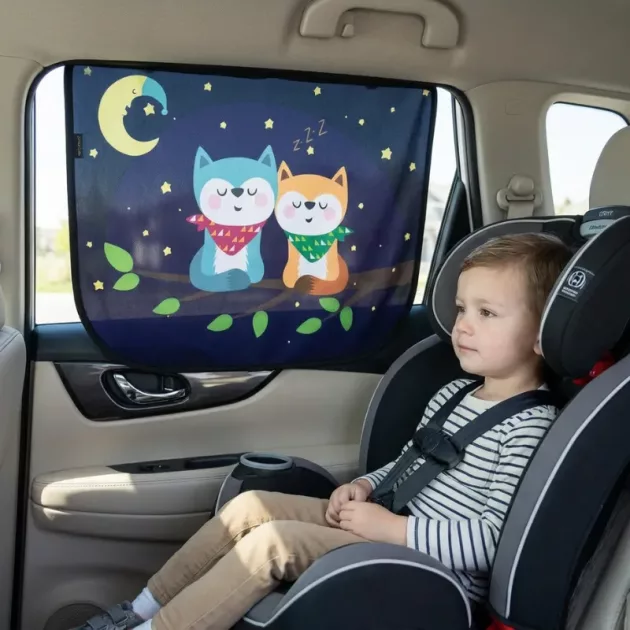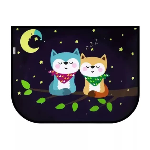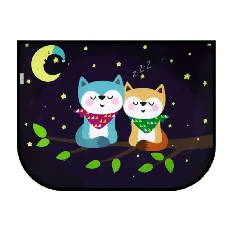 Starka solstrålar gör ofta unga passagerare varma, irriterade och rastlösa. Den här charmiga gardinen skyddar varsamt känslig hud från hårt bländande ljus. Smarta magneter greppar metallramar säkert men lossnar genast vid behov. Söta nattscener uppmuntrar lugn lek och sedan fridfulla tupplurar.
