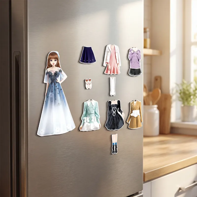 De magnetiska dockorna förvandlade vår gamla whiteboard till en liten modeateljé. Min tjej byter lugnt kläder medan jag lagar mat, helt uppslukad och nöjd.