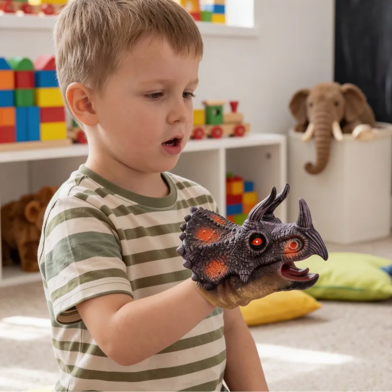 Köpte den här dinovanten för regniga dagar, och nu är den vårt självklara spel. Munnen rör sig bra och ger upphov till så många tokiga berättelser.