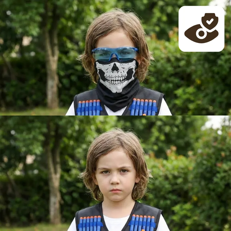Masken och glasögonen är superbekväma. Jag springer, gömmer mig och leker hela dagen utan att oroa mig för att göra illa mig. Dessutom ser jag riktigt cool ut!