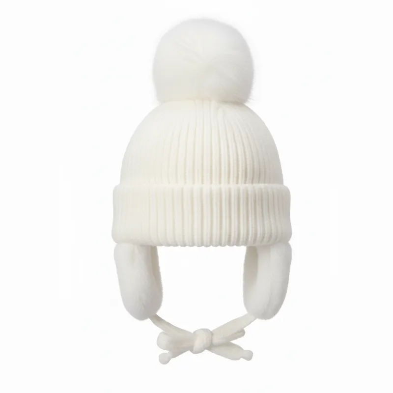 Stickad vintermössa med öronlappar och tofs för barn