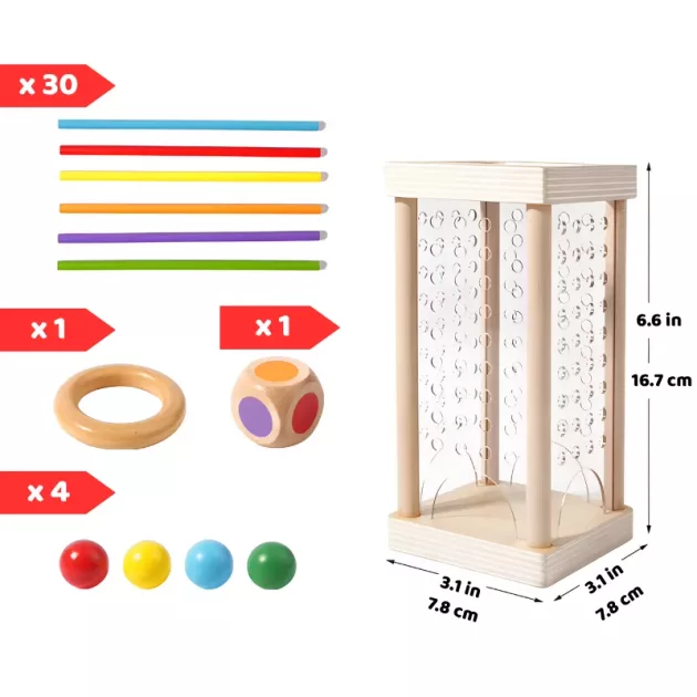 Klart lysande färger och kluriga utingar samlar alla för skratt. Färdigheter stärks när händer rör sig, hjärnor tänker och strategier formas. Njut av spännande omgångar och se samarbete utvecklas medan ni har roligt. Detta träpinne-dragspel gör varje samling ny och rolig med olika sätt att spela.