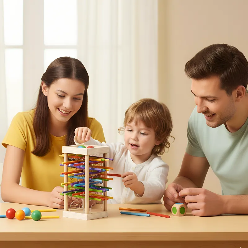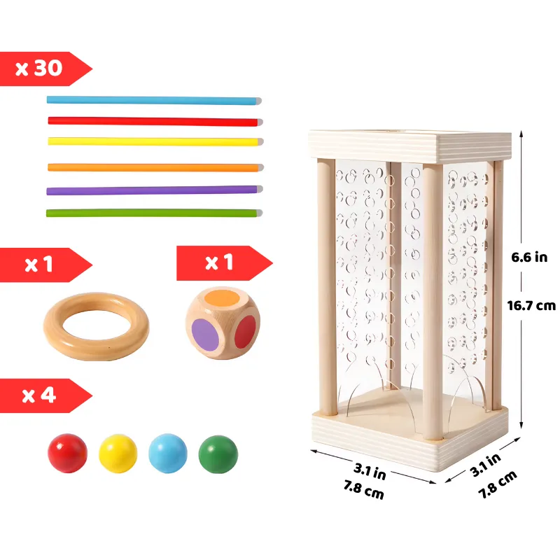 Klart lysande färger och kluriga utingar samlar alla för skratt. Färdigheter stärks när händer rör sig, hjärnor tänker och strategier formas. Njut av spännande omgångar och se samarbete utvecklas medan ni har roligt. Detta träpinne-dragspel gör varje samling ny och rolig med olika sätt att spela.
